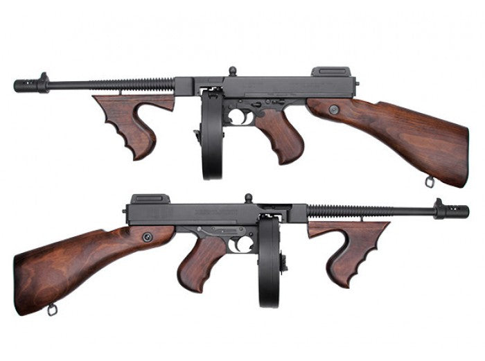 This Thompson M1928 Chicago EBB is realistic designed in all aspect such as the operation system, dimension and materials. It is produced under license that all detailed markings are engraved on the receiver. It is full metal constructed with real wood handguard, grip and stock. Steel is used for the making of sling swivel, screws & nuts and the pivot plate etc. The rear sight is realistic designed and is adjustable as user's preference. It features with electric blowback system to simulate the recoil action of the real rifle. Also, it is equipped with 9mm bearing gearbox and quality internal parts. The stock is capable to store a 9.6V large type battery. Package comes with a 450 rounds drum magazine.